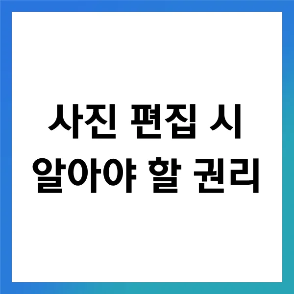 다음으로, 저작권(著作權)은 창작물을 만든 사람에게 주어지는 권리로, 이는 사진에도 적용됩니다. 즉, 원작자의 허가 없이 사진을 편집하거나 복제, 배포하는 것은 저작권 침해에 해당 할 수 있습니다. 예를 들어, 인터넷에서 찾은 사진을 무단으로 편집하여 SNS에 게시하거나 상업적으로 활용하는 것은 매우 위험한 행위입니다. 이러한 행위는 저작권법 위반으로 고소를 당할 수 있으며, 위반 시 최대 5년 이하의 징역 또는 5천만 원 이하의 벌금에 처해질 수 있습니다.